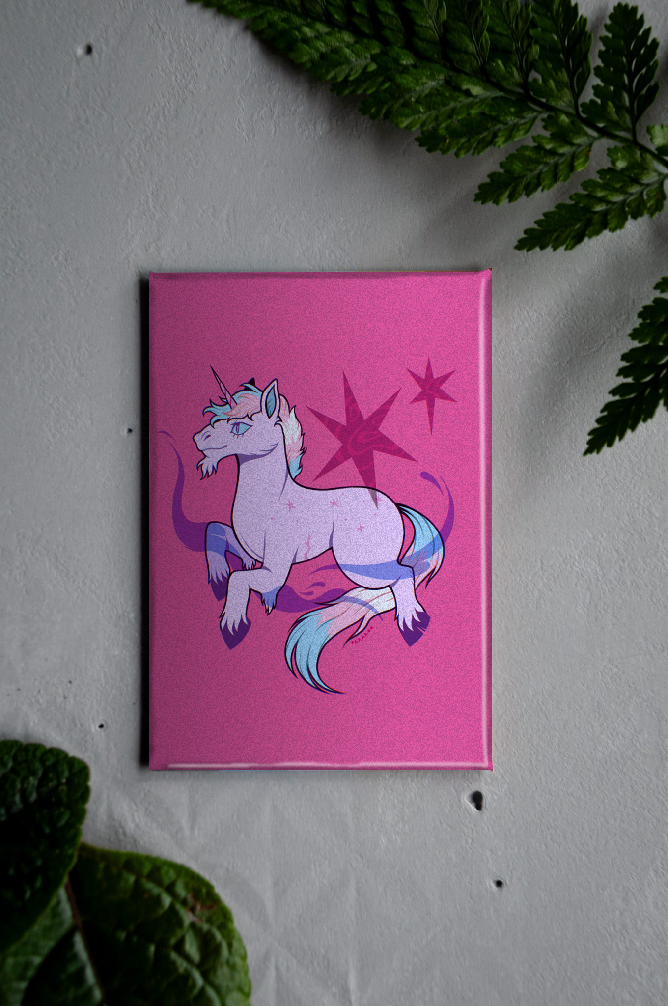 Magnes z ilustracją autorstwa Pararoo przedstawiający jednorożca z motywem flagi transpłciowej.