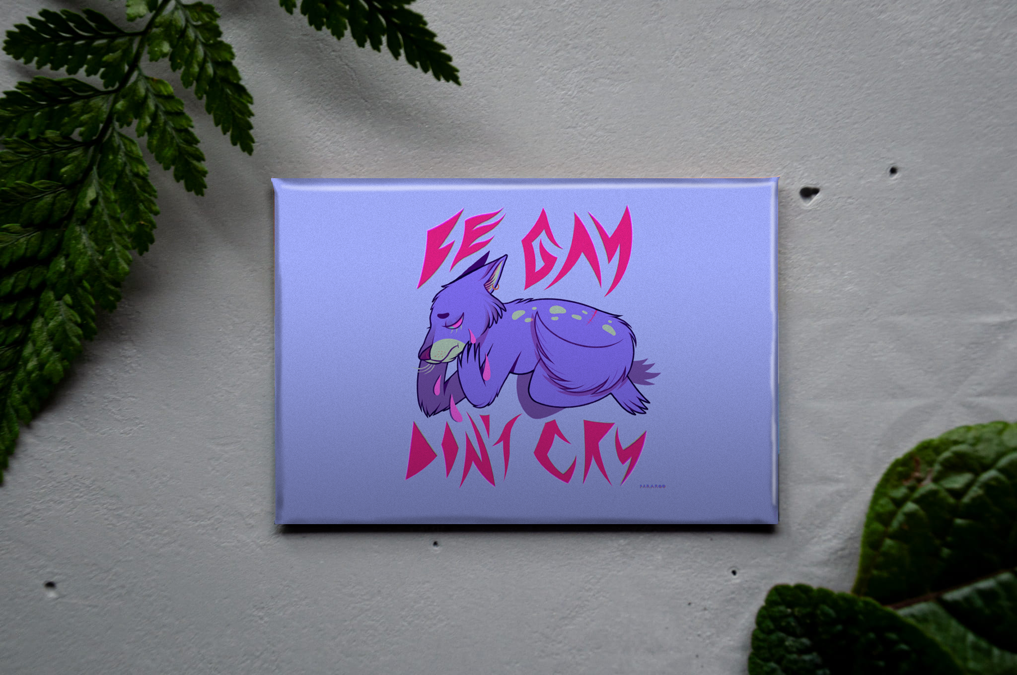 Magnes z ilustracją autorstwa Pararoo przedstawiającą fioletowego pieska z napisem BE GAY DON'T CRY