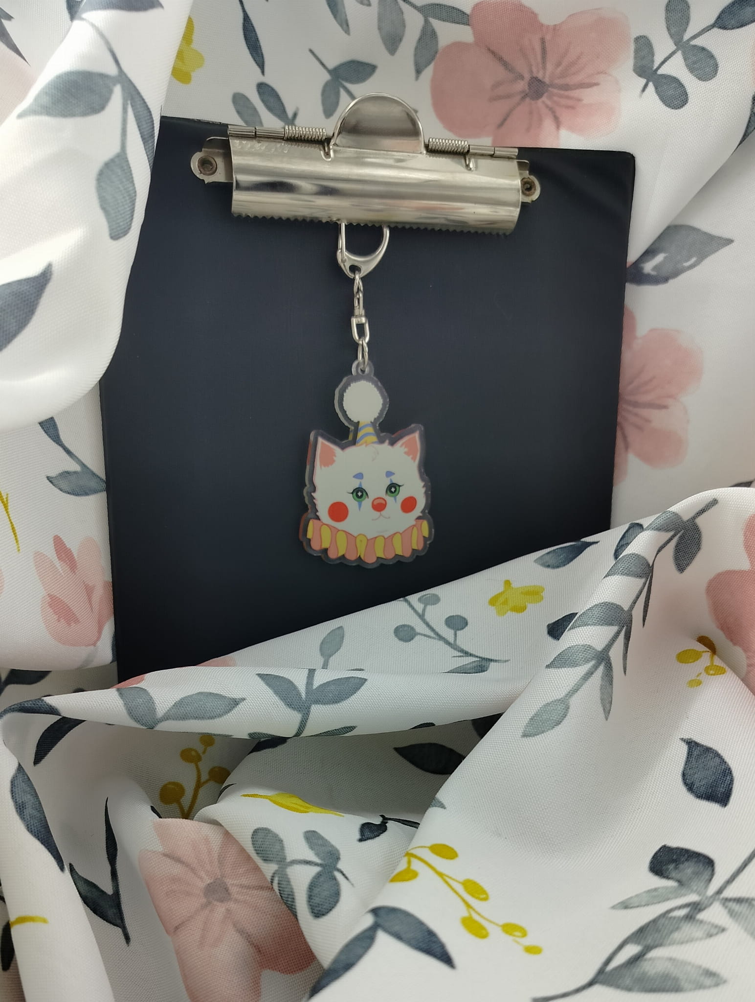 Brelok dwustronny z ilustracją kotka w stroju klauna, zaprojektowany przez YourDeadPrince. Rozmiar ok. 6cm.