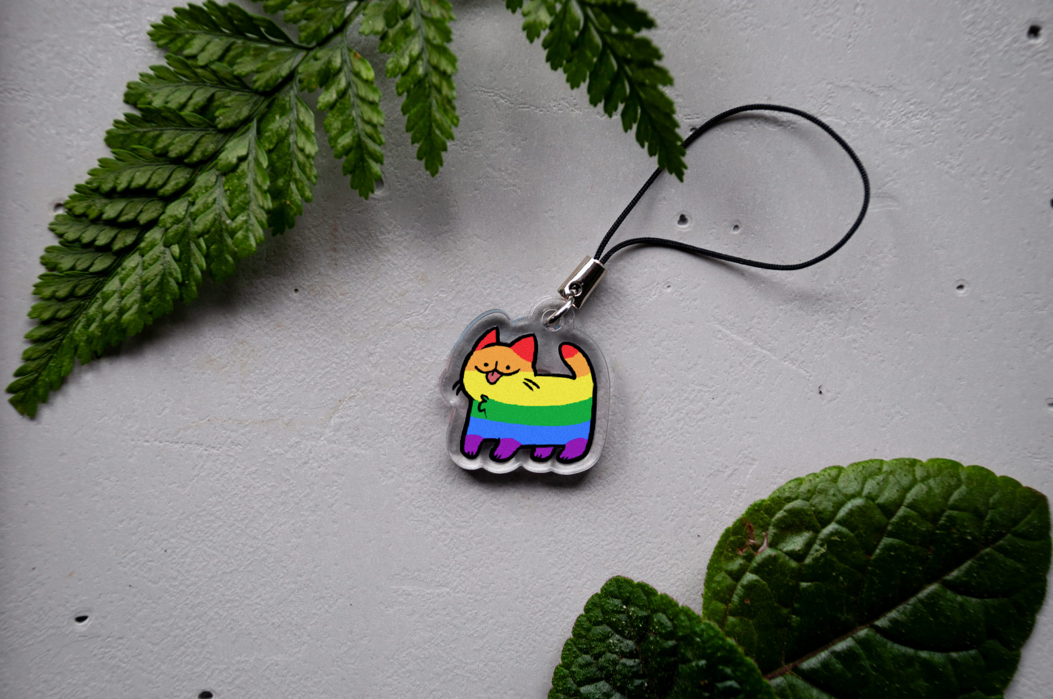Przeuroczy charm do telefonu w kształcie kotka z flagą genderfluid. Dwustronny.