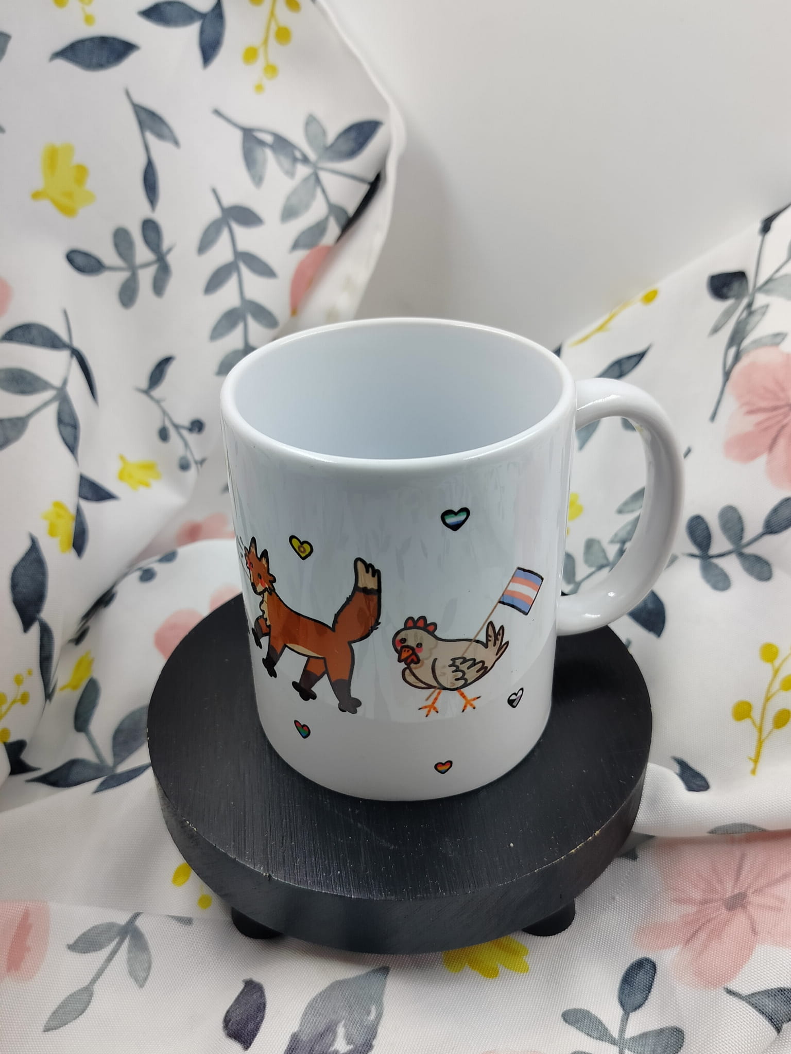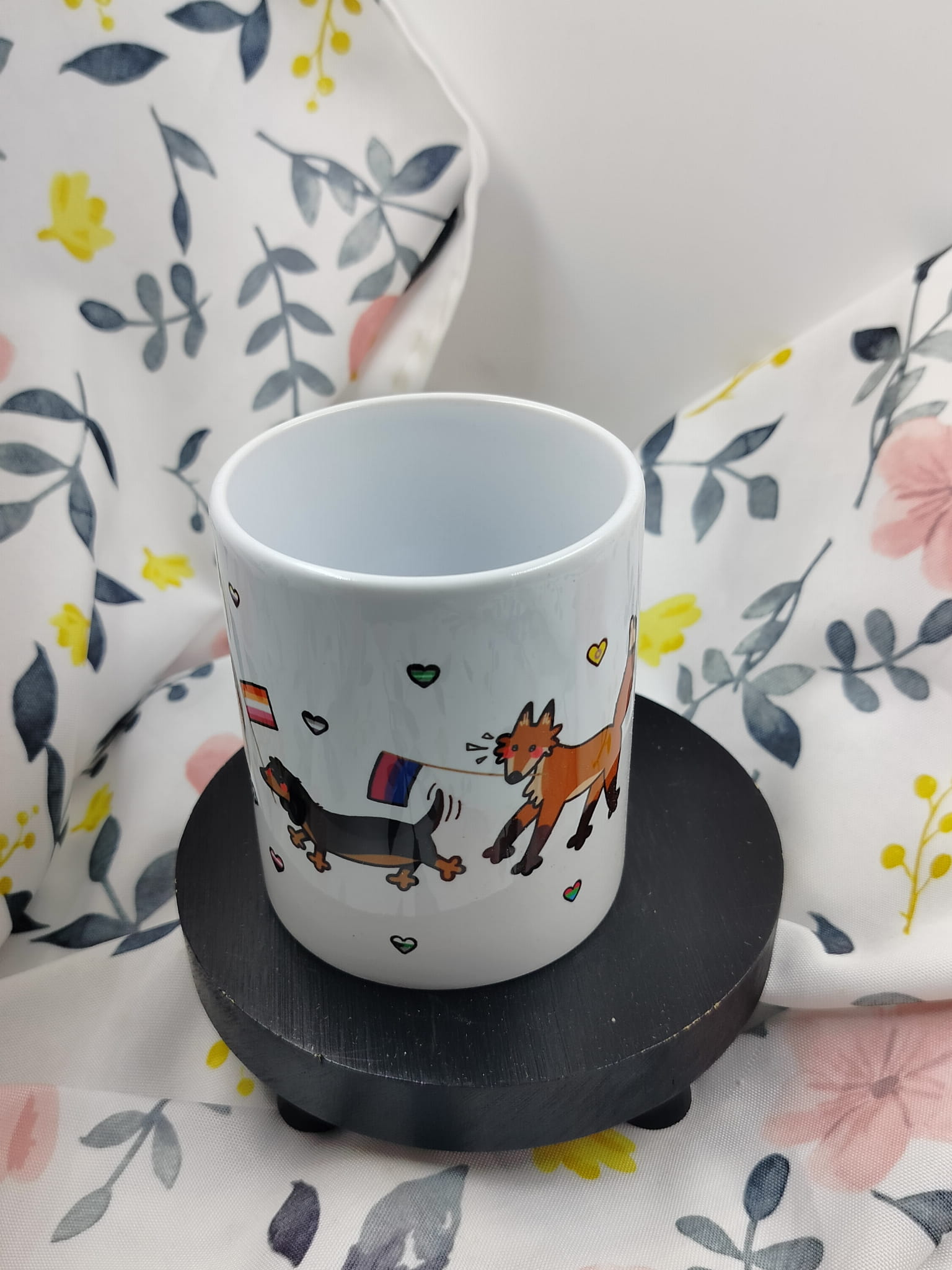 Wzór autorstwa Juice, przedstawiający grupę zwierzaczków niosących różne queerowe flagi.