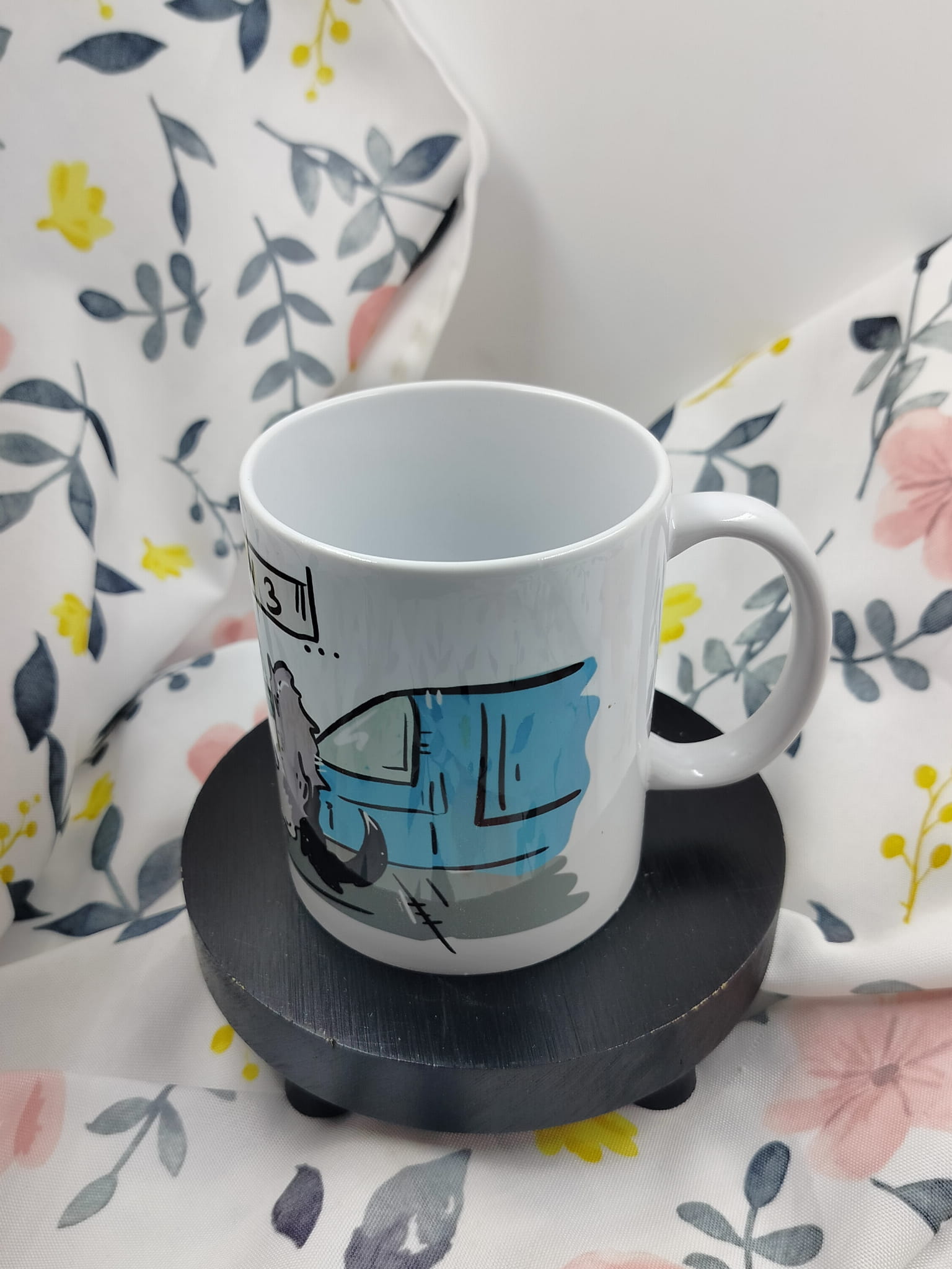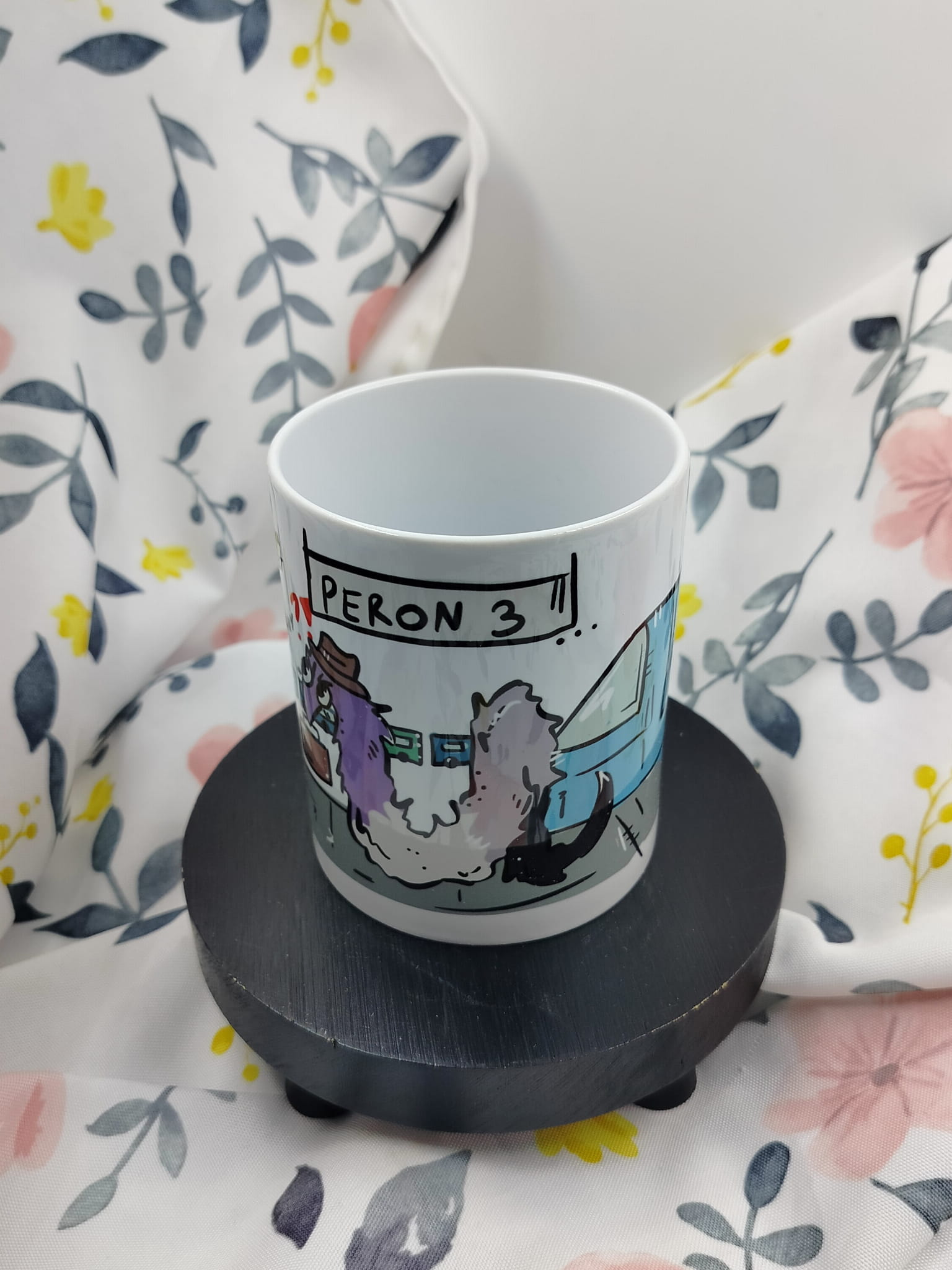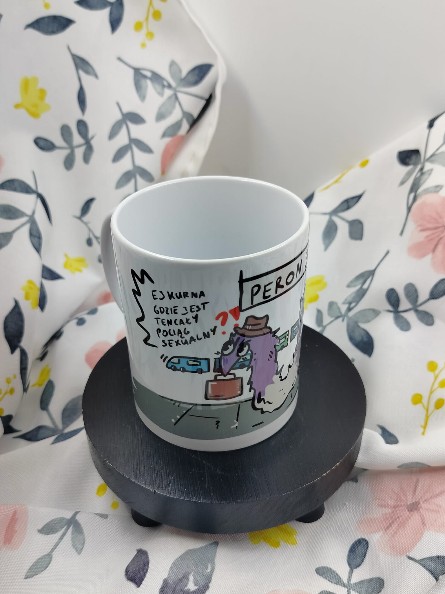Kubek autorstwa Loui z ilustracją pluszowego robaka w kolorach flagi aseksualnej.