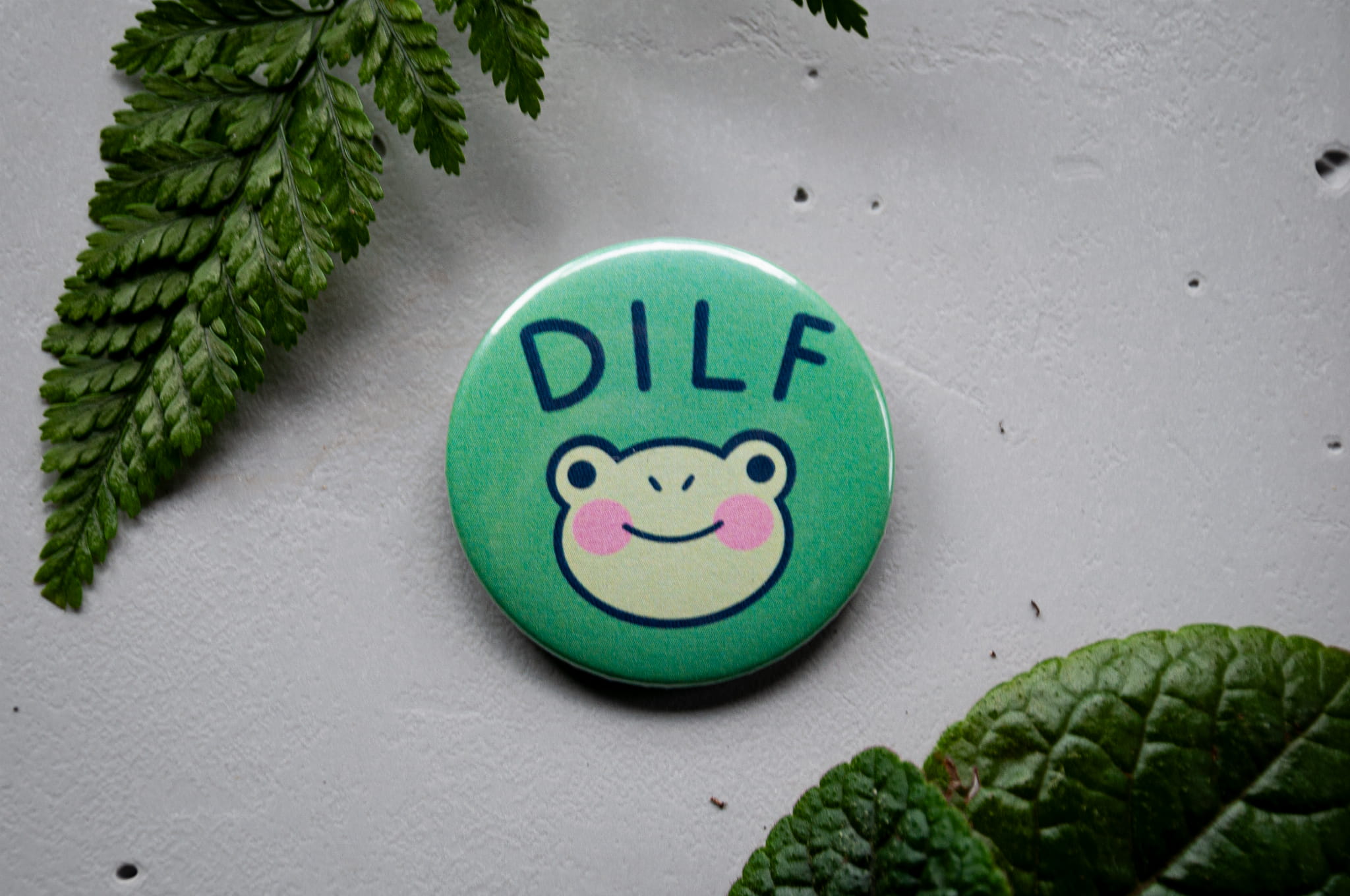 Przypinka z napisem DILF i słodką żabką.
