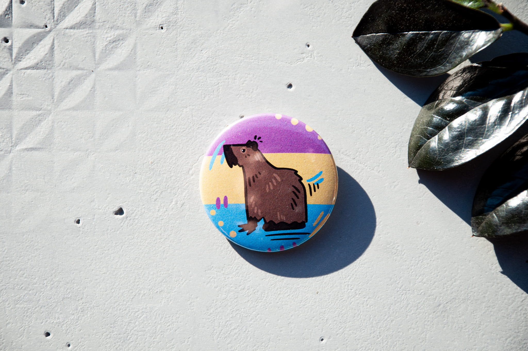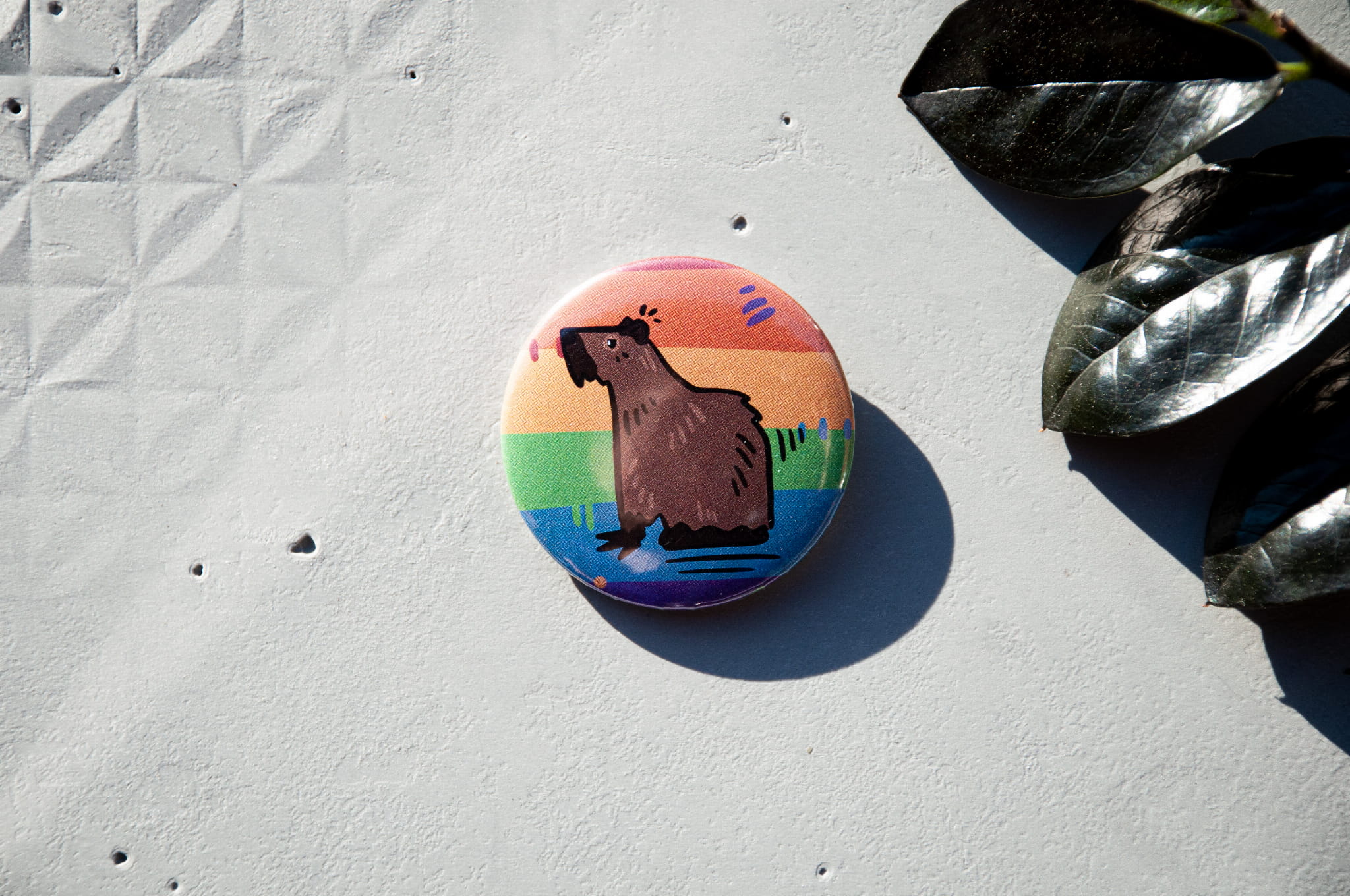 Przypinka z ilustracją kapibary na tle flag społeczności LGBTQIA+