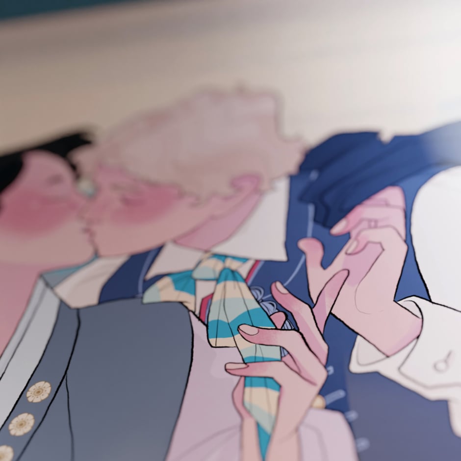 Puzzle Wianki przedstawiają ilustrację stworzoną przez Katarzynę "PannaN" Witerscheim - parę gejów w tradycyjnych strojach - rozbarskim oraz koreańskim.