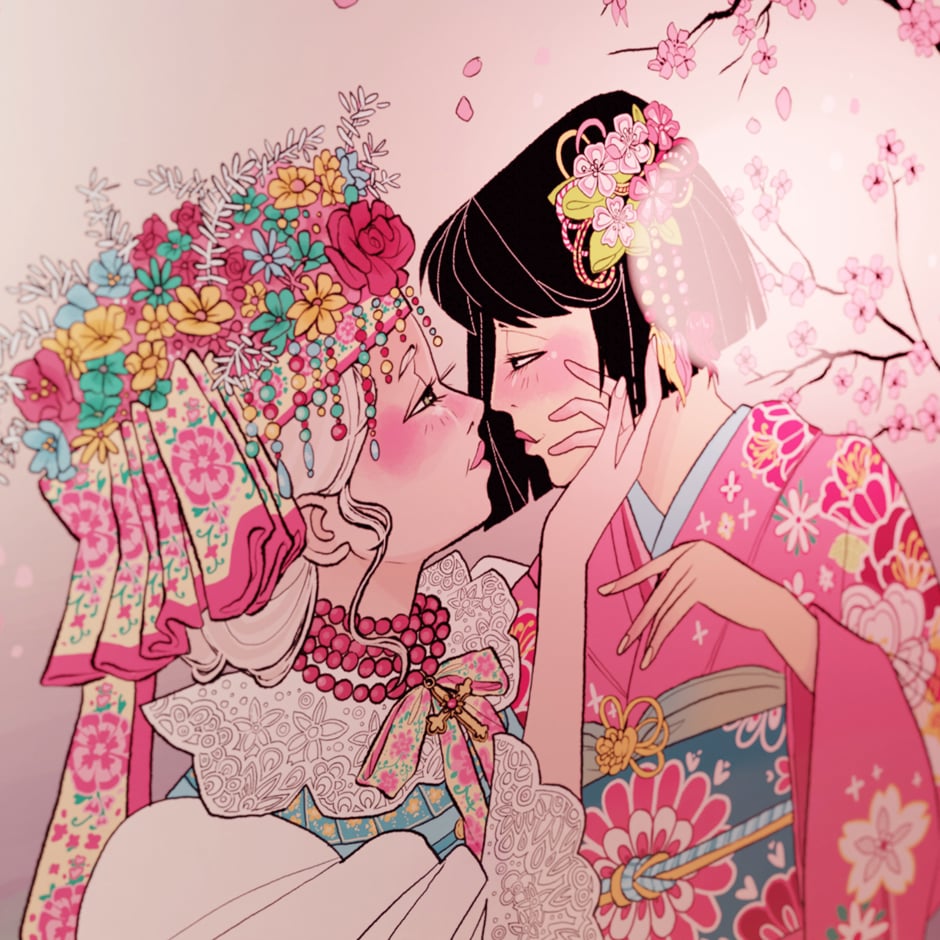 Puzzle Wianki przedstawiają ilustrację stworzoną przez Katarzynę "PannaN" Witerscheim - parę lesbijek w tradycyjnym stroju japońskim oraz śląskim.
