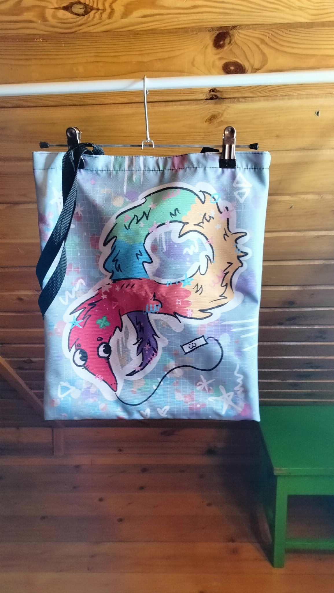 Torba fullprint - po obu stronach posiada nadruk ilustracji pluszowego robala z motywem flagi tęczowej, projektu Loui.